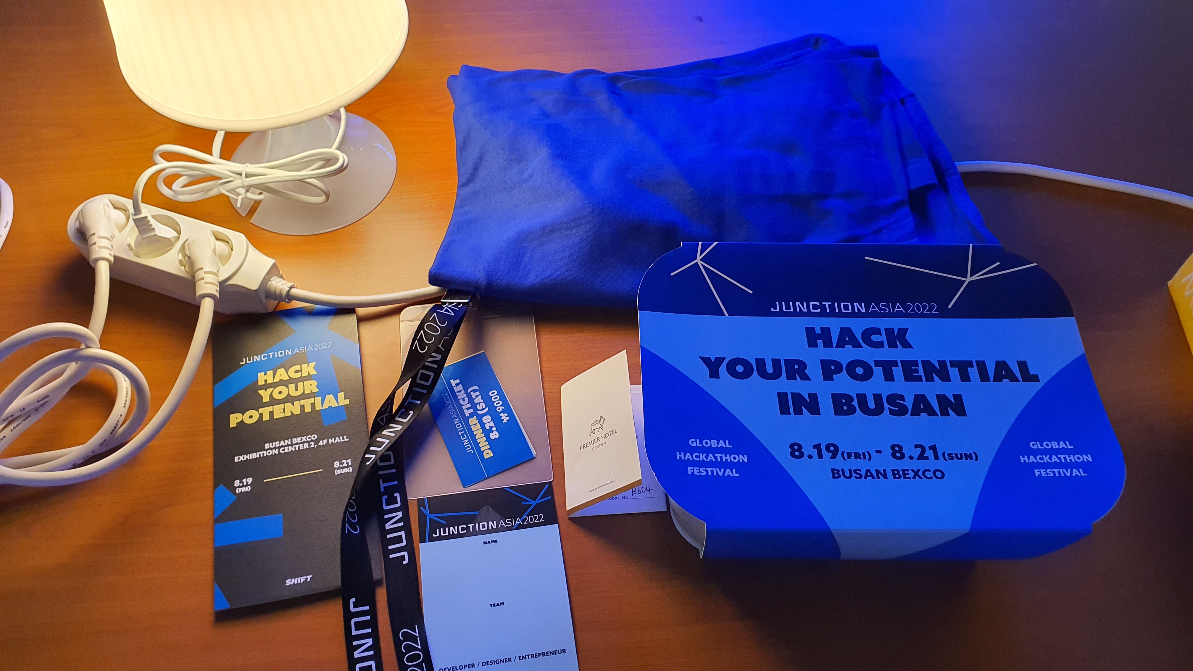 약 300명이 참가하는 대회인 만큼 많은 사람들이 왔고 그만큼 줄이 길었습니다. 다행히도 미리 와서 기다린 덕분에 일찍 들어간 편에 속했던 거 같습니다. 정션 홈페이지에서 로그인을 하면 qr 코드를 발급받을 수 있었고, 해당 qr을 통해 등록 절차를 마칠 수 있었습니다. 등록 할 때 호텔 키와 함께 팀 번호를 안내해주셨고 행사장 안에서 티셔츠와 웰컴 키트를 받을 수 있었습니다.