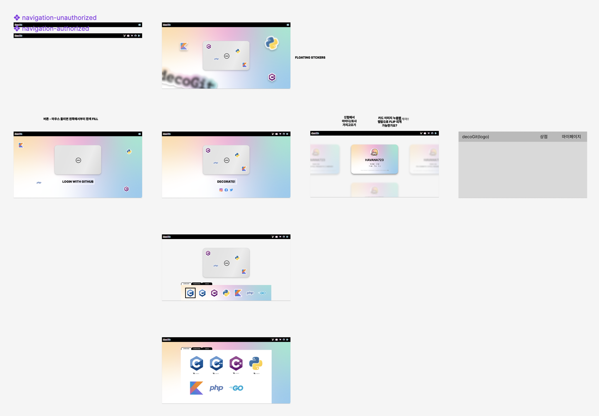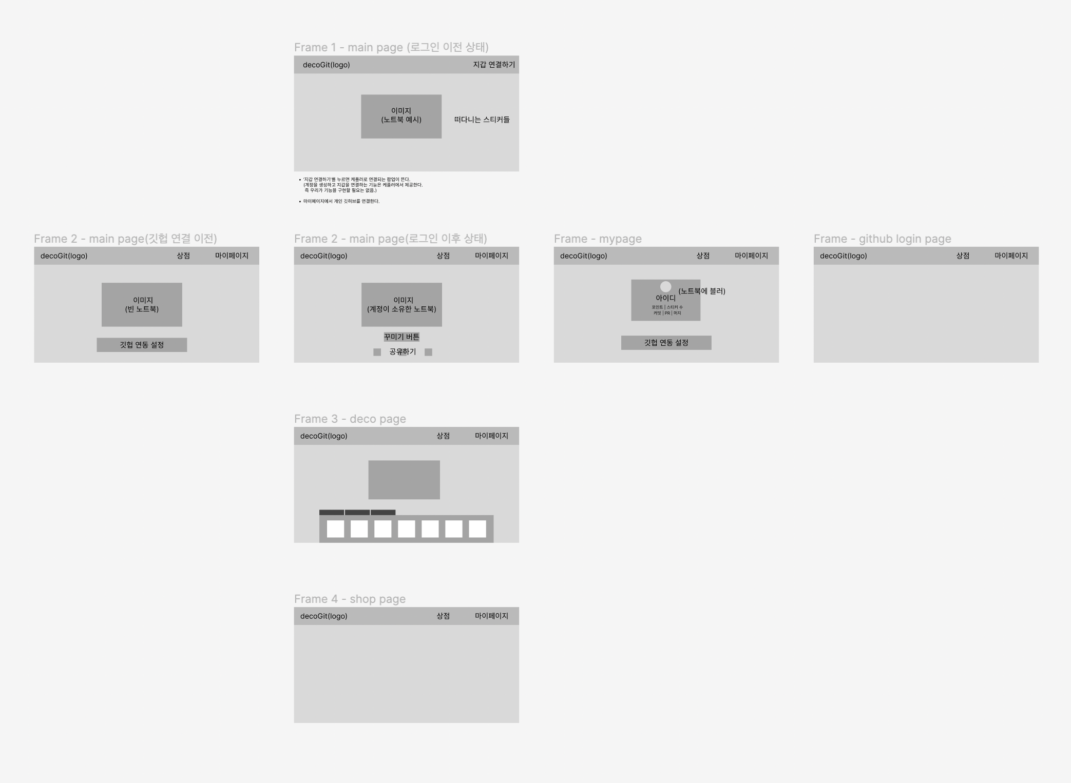 피그마를 이용해 1차적으로 만든 페이지 레이아웃입니다. 전날 이야기했던 프로젝트 기획을 바탕으로 메인페이지-마이페이지-꾸미기페이지-상점페이지로 구성된 간단한 레이아웃을 만들었습니다. 바로 디자인하지 않고 먼저 레이아웃을 만든 것은 처음인데, 디자인 초기 구상을 하기에도 좋고 작업이 엄청 빨라져서 만족스러웠습니다.