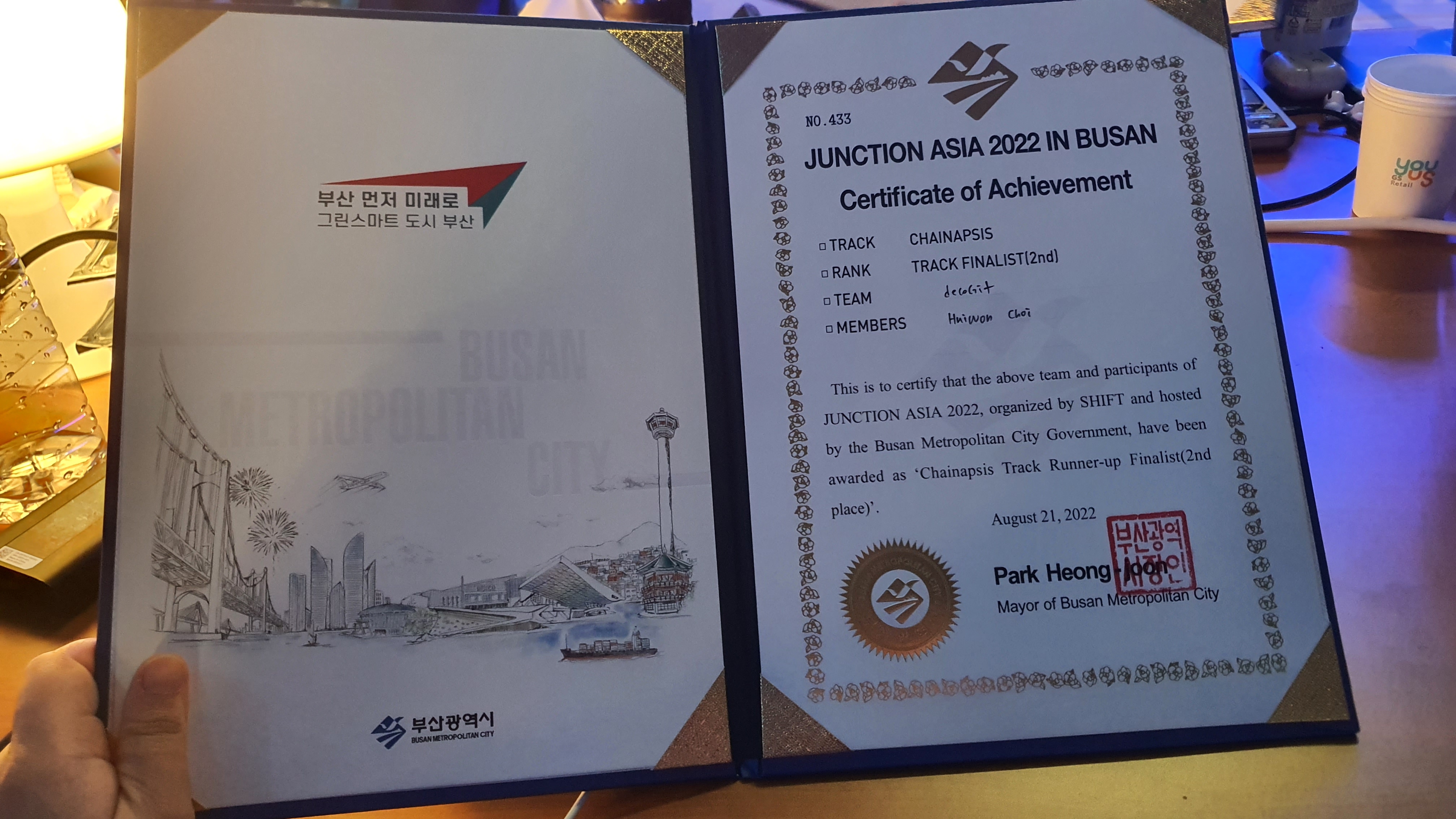 정션 아시아 2022를 열어주신 SHIFT, 저와 같이 팀을 해주신 shiftpsh 님, rita 님, susemeee님, 트랙 후원사였던 chainapsis, 그리고 다른 모든 참여자와 후원사 분들에게 감사 인사를 전하고 싶습니다. 다음에도 이런 기회가 있으면 다시 한 번 참가하고 싶습니다. 다들 수고하셨습니다!