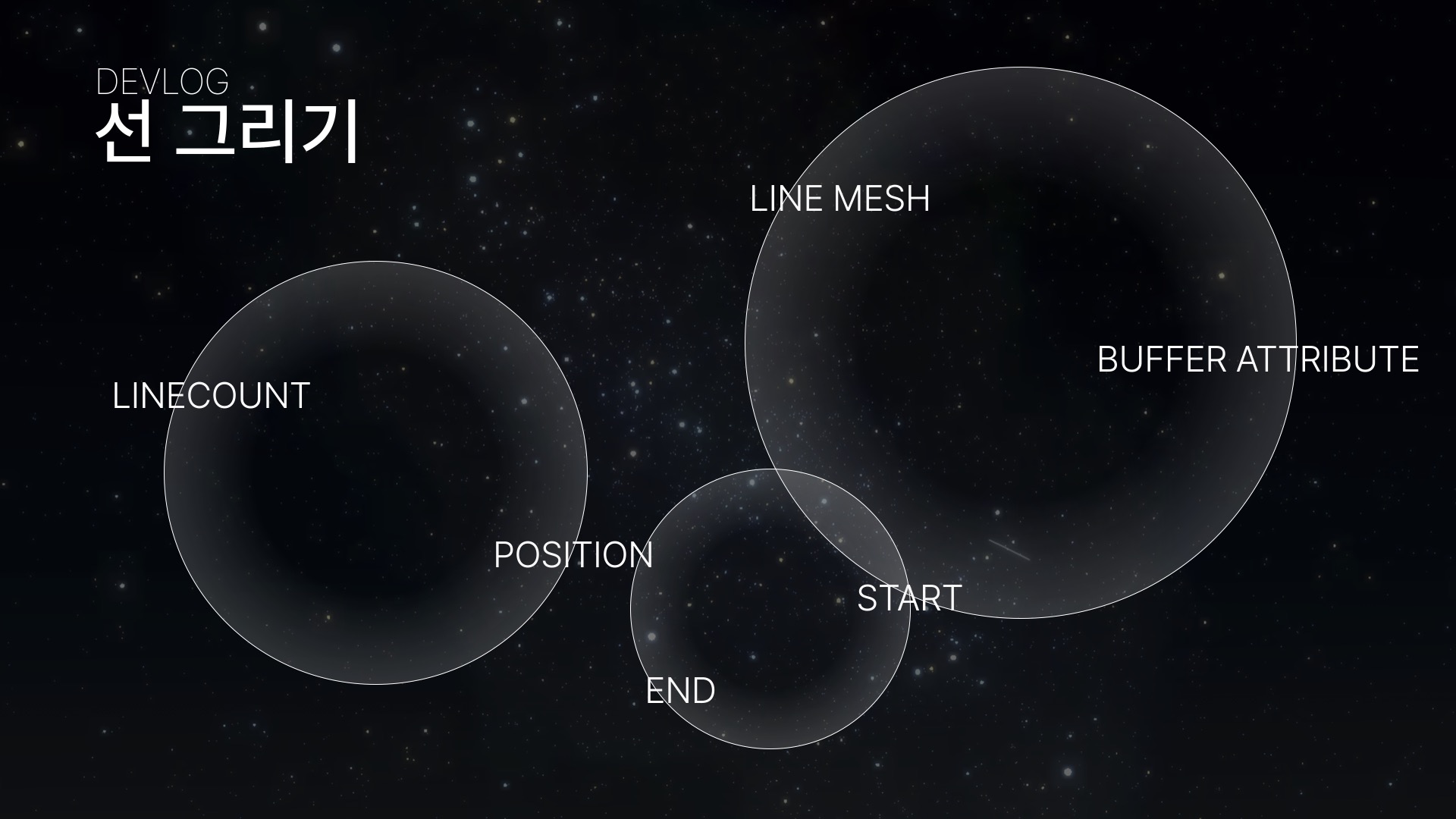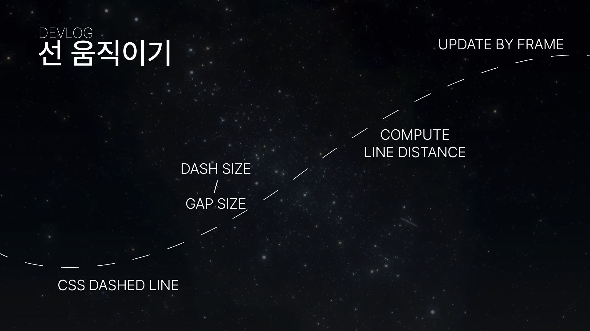 여기서 드는 생각은... 유성이 그려지는 것도 이렇게 구현하면 안 되냐는 거긴 한데, 그 편이 일관성 있고 좋을 것 같지만 열심히 SVG element와의 conflict를 고치던 시간이 아깝기도 하고 dahsed line을 이용하는 방법이 너무 흥미로워서 두 가지 방법을 섞어서 구현하였습니다. line의 geometry를 업데이트 하는 것 보다 material 단에서 처리해주는 것이 성능 상으로 더 좋지 않을까? 하는 기대도 있었습니다. (실제로 그런지는 잘 모릅니다.)
