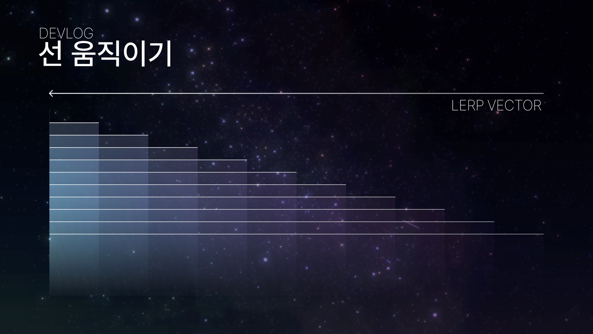 gap offset의 대체제로 찾은 방법은 line의 길이 자체를 바꾸는 것입니다. 유성이 다 그려지면, 시작점의 위치를 조금씩 끝점의 위치와 가깝게 업데이트하면 유성이 서서히 사라지는 효과를 구현할 수 있습니다. 매 프레임마다 변하는 시작점의 위치는 Vector3에 있는 lerp라는 메소드를 통해 구할 수 있습니다. 이렇게 프레임마다 시작점의 위치를 바꾸면 유성이 사라지는 효과까지 구현 완료입니다.