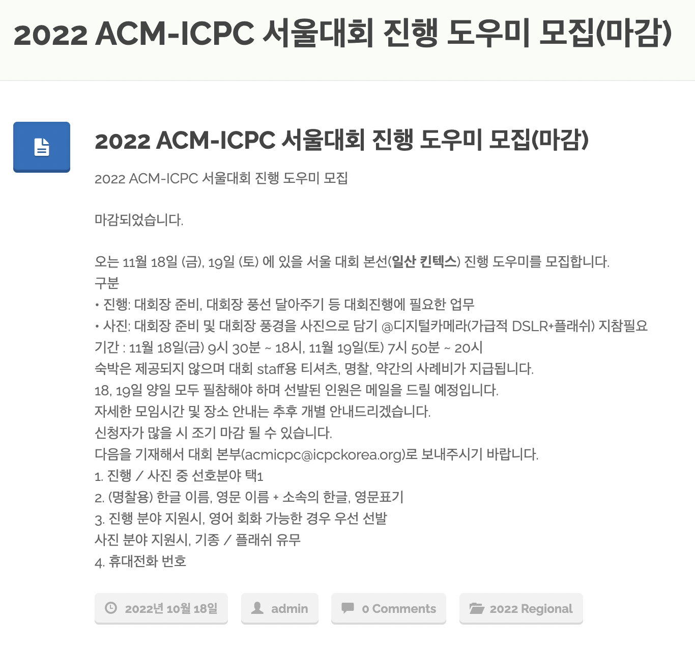 ICPC Asia Seoul Regional 2022에 스태프로 참가했습니다. 너무 바쁘고 정신 없어서 사진 찍은게 없다 보니 후기에 쓸 이야기도 많이 없습니다. 기억이 사라지기 전에 간략하게 써서 남기려고 합니다.
