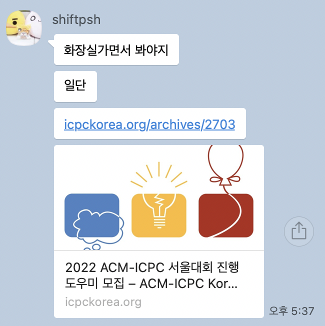 ICPC 전에 스태프들 카톡방이 따로 만들어졌는데, 들어가보니 반 정도는 아는 이름들이라 신기했습니다. PS 판 참 좁은 거 같아요.