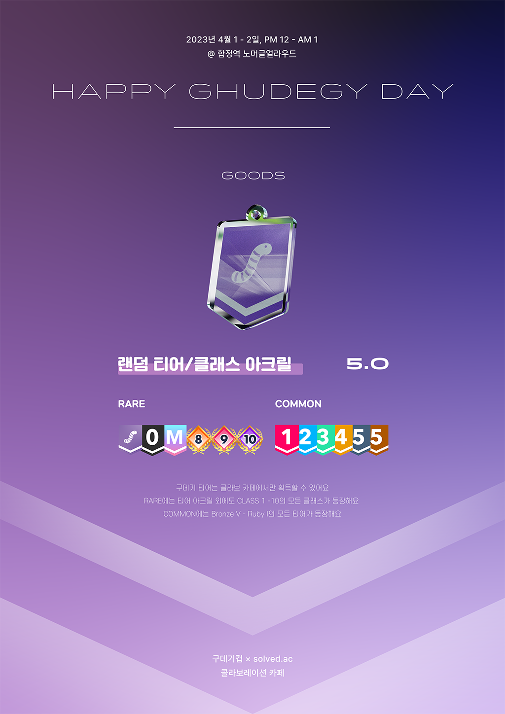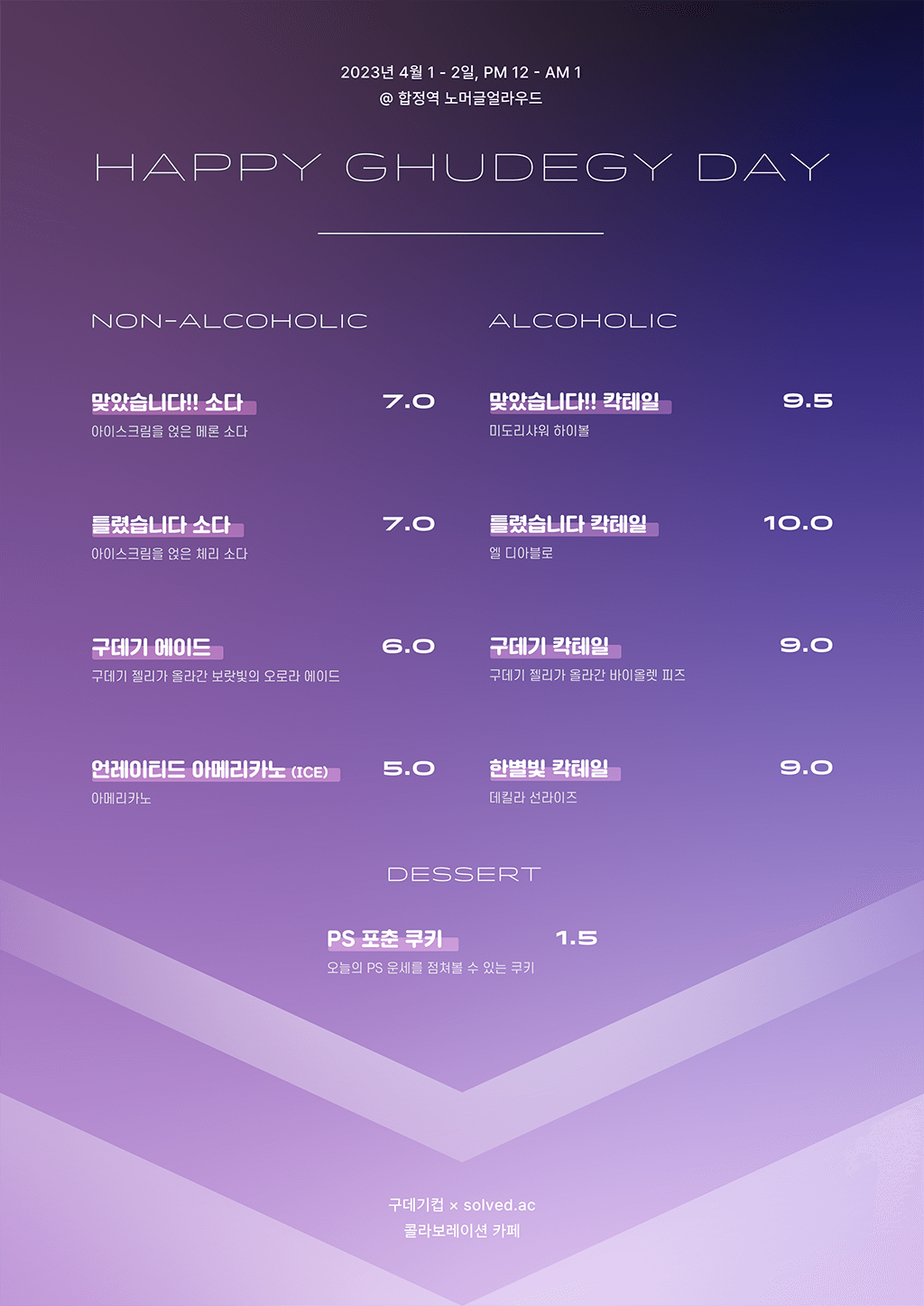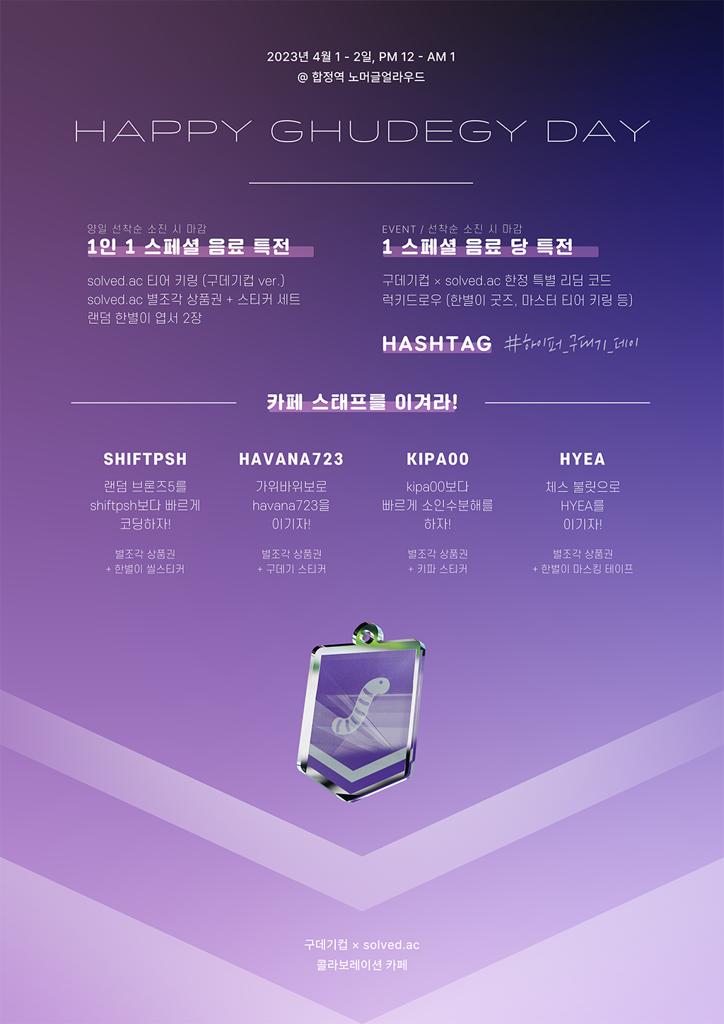 4월 1일부터 4월 2일까지, 이틀에 걸쳐 구데기컵 ✕ solved.ac 카페 『먹었습니다!!』가 진행되었습니다. 다들 재밌게 즐기셨을까요?