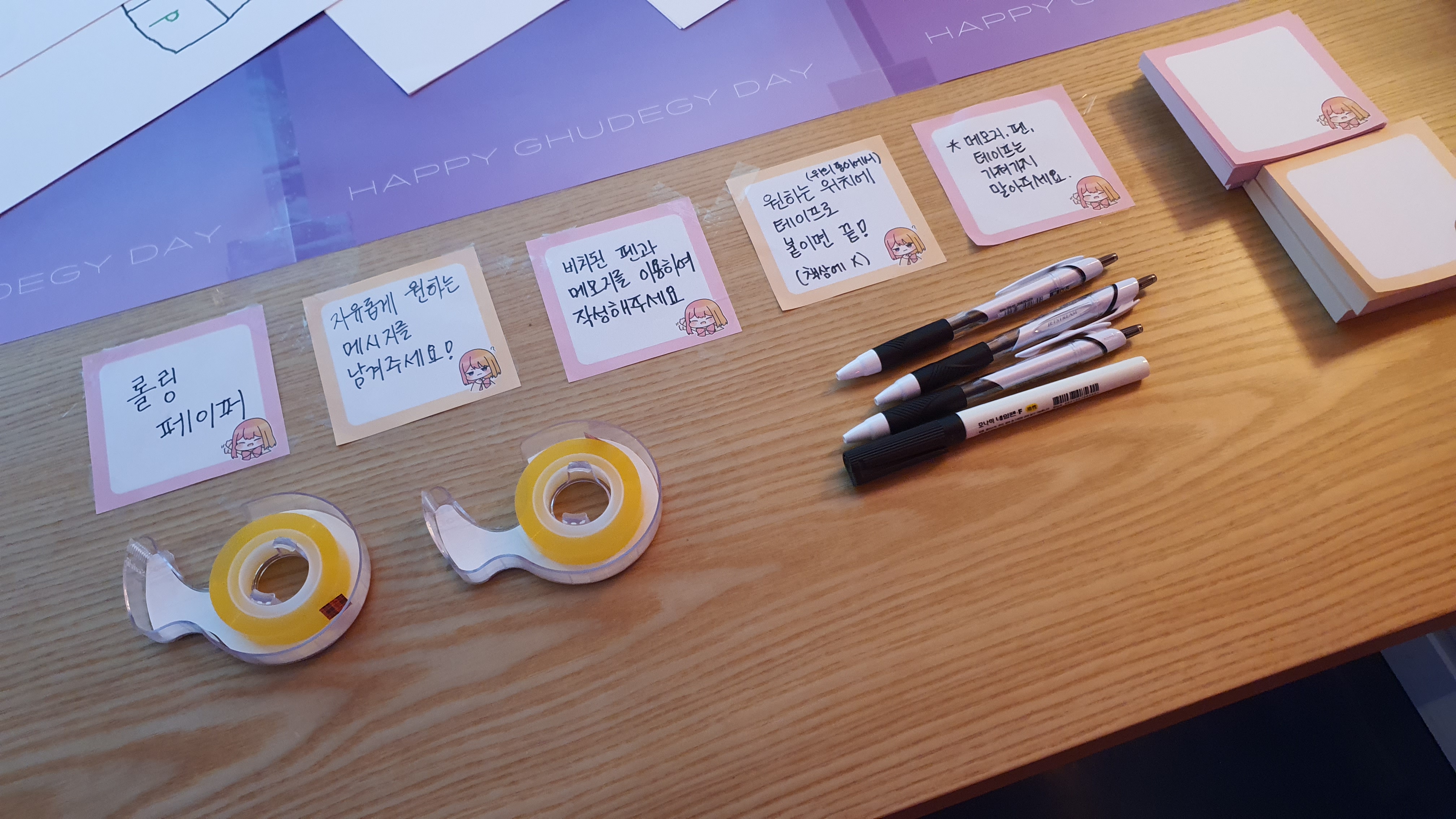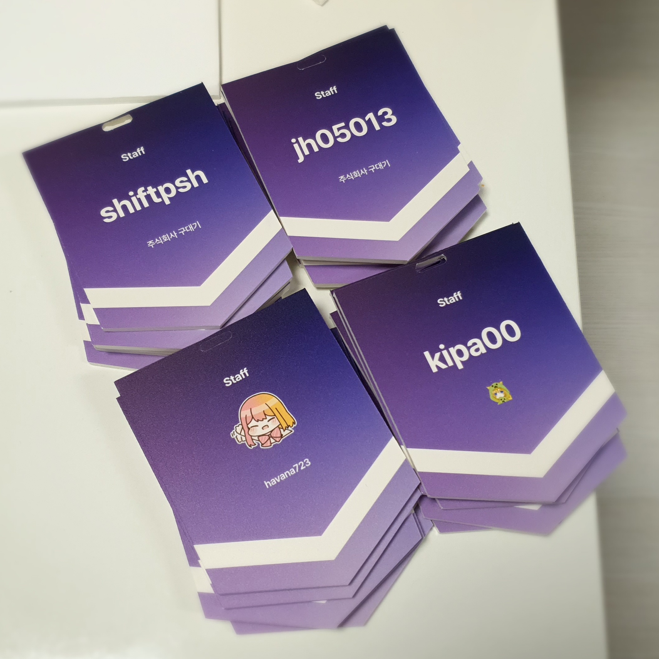 이렇게 자세한 기획을 확정하고 난 후, 굿즈들의 제작 기간을 고려해 약 2주 전 수요조사를 기준으로 각종 굿즈들을 발주하였습니다. 네 그렇습니다. 2주 전 기준입니다. 제 기억에 해당 시기에 100명 쯤이 수요조사에 참가해주셨던 것 같습니다. 처음 기획할 때 30명을 예상하던 것보다 많은 분들이 수요조사를 해주셔서 미리 준비해놓은 몇 몇 굿즈들은 추가 발주를 하기도 하였습니다. 이렇게 100명 방문 기준으로 굿즈와 이벤트 상품들, 럭키드로우를 준비하였는데...