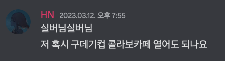 평소처럼 후루요니 디스코드를 보고 있던 어느 날 디스코드에서 후루요니 콜라보 카페가 열린다는 공지를 보게 되었습니다. 콜라보 카페... 되게 가슴이 두근거리는 단어 아닌가요? 저만 그런가요? 저만 그럴지는 모르지만 저는 굉장히 두근거린다고 생각했습니다... 그래서 막연히 어느 장르가 되었든 좋으니 콜라보 카페를 열어보고 싶다는 생각을 가지게 되었습니다.