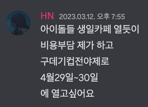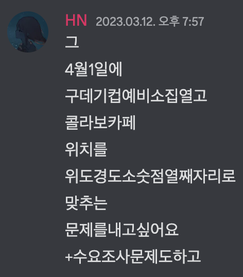 맨 처음 생각했던 날자는 4월 29~30일이었습니다. 구데기컵 전야제라는 이름으로 콜라보 카페를 열려고 기획했는데 여러가지 이유로 인해 4월 1일로 바뀌었습니다. 첫 번로는 kipa00 님과 제가 4월 29일에 중간고사(...)가 있다는 사소한 이슈가 있었고, 두 번째로는 대관하려고 알아본 카페가 해당 날짜에 이미 대관이 예약되어 있었습니다. 다른 카페를 알아보는 방안도 있었는데 유명한 카페는 대관 일정이 꽉 차 있는 경우가 많고 다른 카페들은 대부분 대관비가 비싸고 최소 방문 인원도 예상보다 많이 필요했습니다.. (이 때는 진짜 정말로 얼마나 올지 몰랐습니다...) 그래서 대신 원래 구데기컵이 열리던 4월 1일에 카페를 진행하게 되었습니다. 시간이 촉박했지만... 저는 저를 믿었습니다. 할 수 있어요.