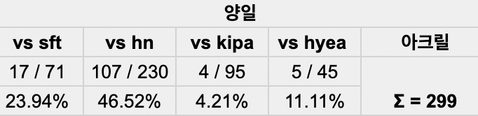 이벤트의 경우 도전 횟수와 도전자들의 승률은 위와 같습니다. 의외로 가위바위보가 50프로보다 조금 낮은 확률을 보였으며, 나머지 세 분의 경우 꽤 낮은 승률을 기록했습니다. 솔직하게 저는 shiftpsh 님을 상대로 약 40%, HYEA 님과 kipa00 님을 상대로 약 20% 정도의 승률이 나올 것이라고 예상하고 그에 맞춰서 상품을 준비했는데... 제가 스태프 분들을 너무 얕봤던 것 같습니다. 스태프 분들에게도 혼났어요 잘못했습니다... 다음에 비슷한 걸 한다면 도전 자체에 보상을 주거나 전부 패배했을 때의 보상을 주고 싶습니다. 4패 하고 가신 분들께 너무 죄송했습니다. 많이 많이 드리고 싶었는데...
