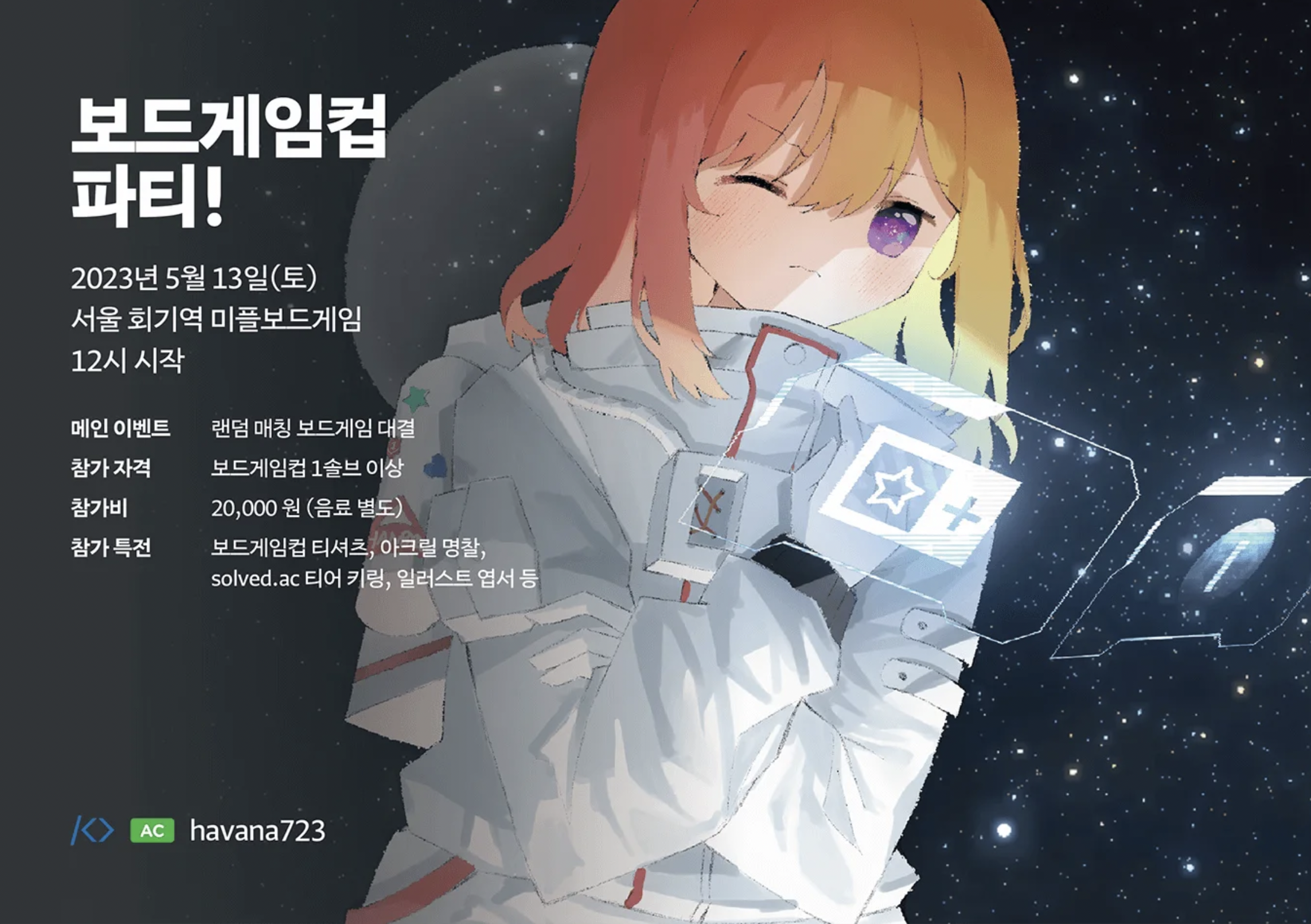 1월 14일, 한 해의 시작을 <보드게임컵>과 함께했습니다. <보드게임컵>은 저번 회고에서도 언급이 되었는데, 제가 처음으로 개최하는 개인대회였습니다. 평소에 보드게임을 굉장히 좋아하기 때문에 이를 소재로 한 문제들을 만들고 대회를 준비하였습니다. 개인 대회라고는 하지만 제가 출제한 문제는 할리갈리, 크레이지 타임, 벚꽃 내리는 시대에 결투를, 수 나누기 게임 이렇게 네 개로 나머지 문제들은 다른 분들께서 많이 도와주셨습니다. 도와주신 출제검수진들 덕분에 큰 문제 없이 대회를 개최할 수 있었습니다. 이 자리를 빌어 다시 한 번 감사의 말씀을 드려요. 다들 정말 감사해요!!